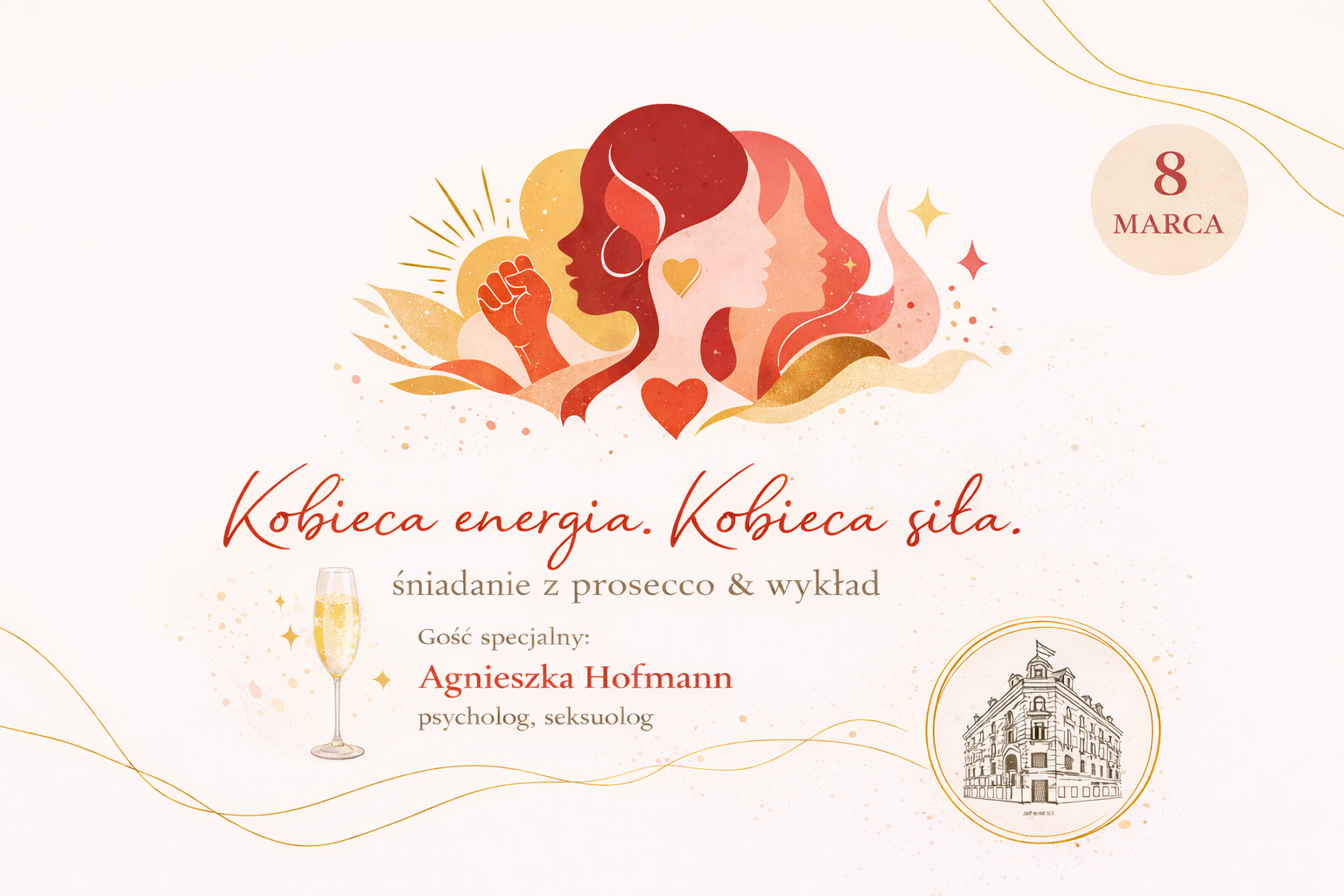 8 marca zapraszamy na wyjątkowy Dzień Kobiet w Café Młyńska, połączenie pięknego, spokojnego poranka przy śniadaniu z kieliszkiem Prosecco oraz inspirującego wykładu „Poczucie własnej atrakcyjności – supermoc, która wspiera bez presji”.
